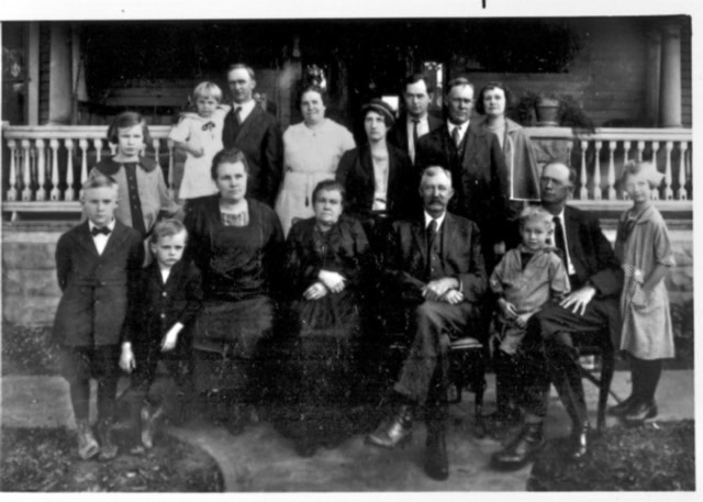 At P. G. Back home in Billings, Oklahoma. About 1920. The swing on the left porch still exists at the house (2019). Front row Merlin Emil Back, Francis Wesley Stephenson, Jr., then William Philip Stone. Second row: Helen Nadine Stone, Anna Helen Back, Louise Magdalena Meisburger, Philip Gottfried Back, William Thomas Stone, Hannalou Estelle Stephenson. Back row: Marquerite Viola Stephenson, Francis Wesley Stephenson, Maybelle Margaret Back, Maybelle Alliance Jones, Philip Back, Emil Philip Back (1883-1929), Mary Nadine Back. Sadly all are gone.