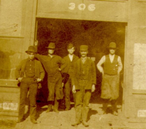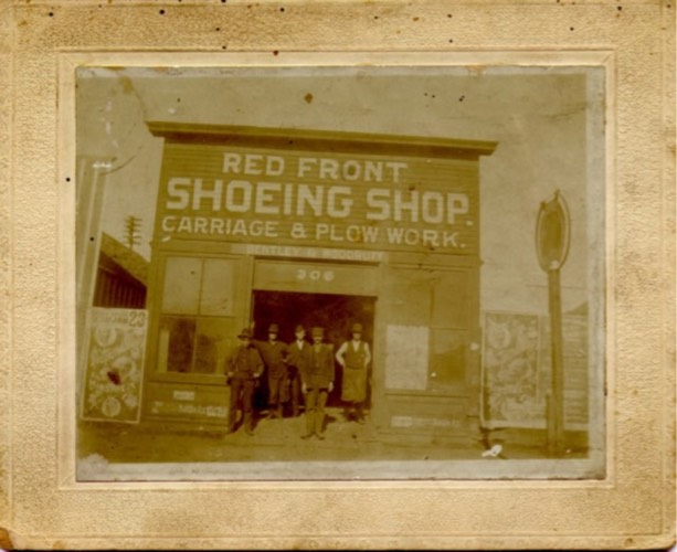 Burrton Woodruff, Sr. with his father in law at their blacksmith and horse shoeing shop in Wichita, Kansas